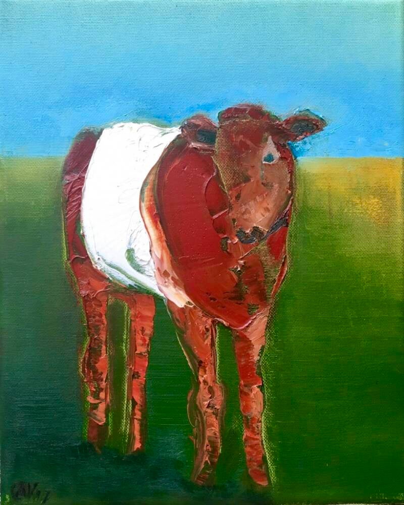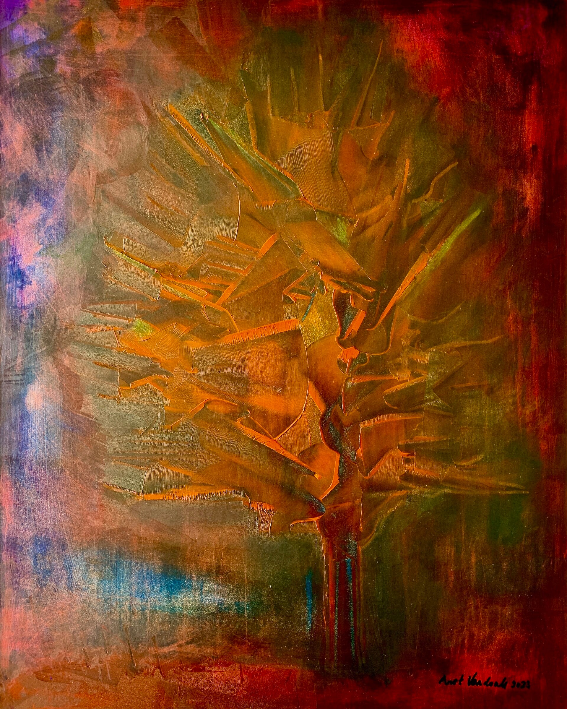 Kleur is vaak mijn vertrekpunt: ik begin intuïtief, maar neem ook afstand om te kijken waar het werk naartoe gaat. En ik nodig de kijker graag uit tot eigen interpretaties.