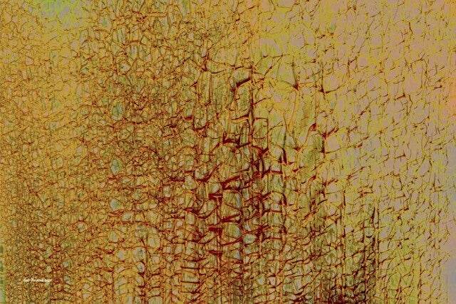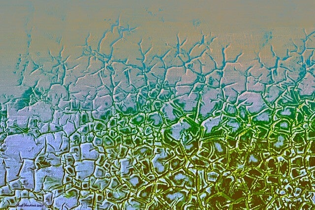 Als ik experimenteer met materialen, ontstaan er soms bijzondere structuren. Zie de eerste foto hieronder: het resultaat van een poging om een ondergrond te beschilderen die daar niet geschikt voor bleek te zijn. En misschien had ik ook niet lang genoeg gewacht tot de gesso droog was. (Gesso is een onderlaag voor olieverf.)