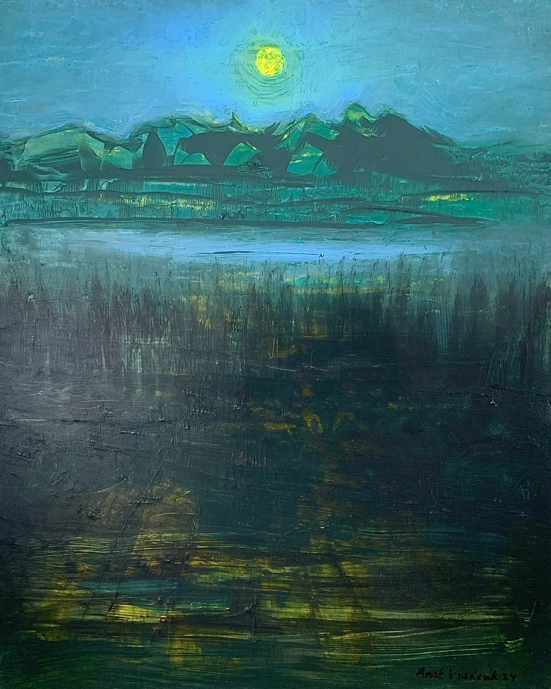 Ik schilder ook graag zonnen en manen. Soms stralen die ook wel iets mystieks uit. Maar in mijn werk zijn ze er simpelweg ook om te zeggen: kijk, dit is een landschap. Je ziet vlakken, kleuren en lijnen, maar omdat er een cirkel of een sikkel boven staat, zie je ineens ook een landschap met een zon of een maan. Zo’n vorm kan dus een mooi accent zijn. Een ‘binnenkomer’ in het schilderij die maakt dat je iets ziet wat je eerst niet zag.